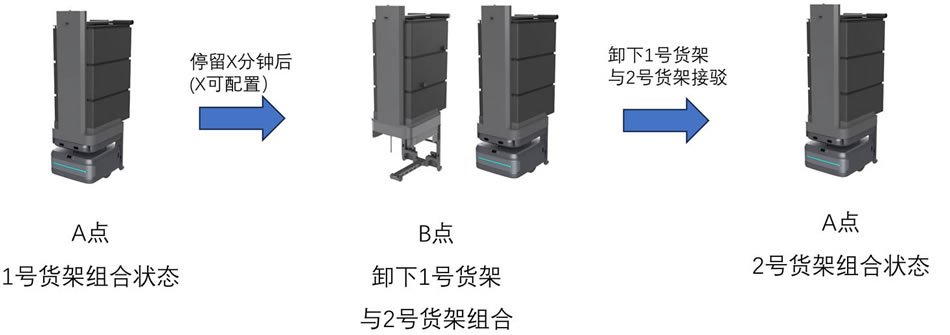 流程簡(jiǎn)述:機(jī)器人在A點(diǎn)與1號(hào)上艙保持組合狀態(tài)停留X分鐘后,由A點(diǎn)前往B點(diǎn),抵達(dá)B點(diǎn)后將1號(hào)艙落至1號(hào)艙位并移動(dòng)至2號(hào)艙位與2號(hào)艙自動(dòng)接 駁完成組合后由B點(diǎn)返回A點(diǎn),抵達(dá)A點(diǎn)在A點(diǎn)停留X分鐘后循環(huán)該流程,過(guò)程中電量低于配置及到達(dá)指定充電時(shí)間會(huì)自主前往充電樁充電;