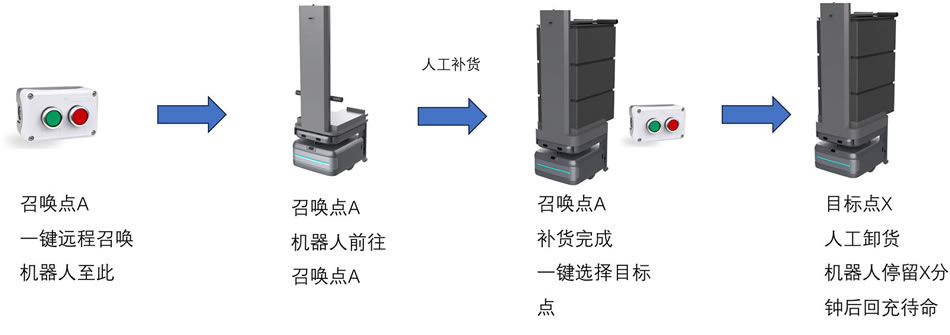 流程簡(jiǎn)述:按鈕一鍵召喚機(jī)器人前往召喚點(diǎn),按鍵選擇需要機(jī)器人配送的目標(biāo)點(diǎn),機(jī)器人完成配送任務(wù)后自主返回充電樁;