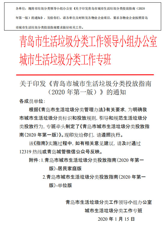 根據(jù)《青島市生活垃圾分類管理辦法》有關(guān)要求,為明確我市城市生活垃圾分類標(biāo)識和投放規(guī)則,引導(dǎo)和規(guī)范生活垃圾分類投放行為,專班牽頭制定了《青島市城市生活垃圾分類投放指南(2020 年版)》,F(xiàn)印發(fā)給你們,請遵照執(zhí)行。