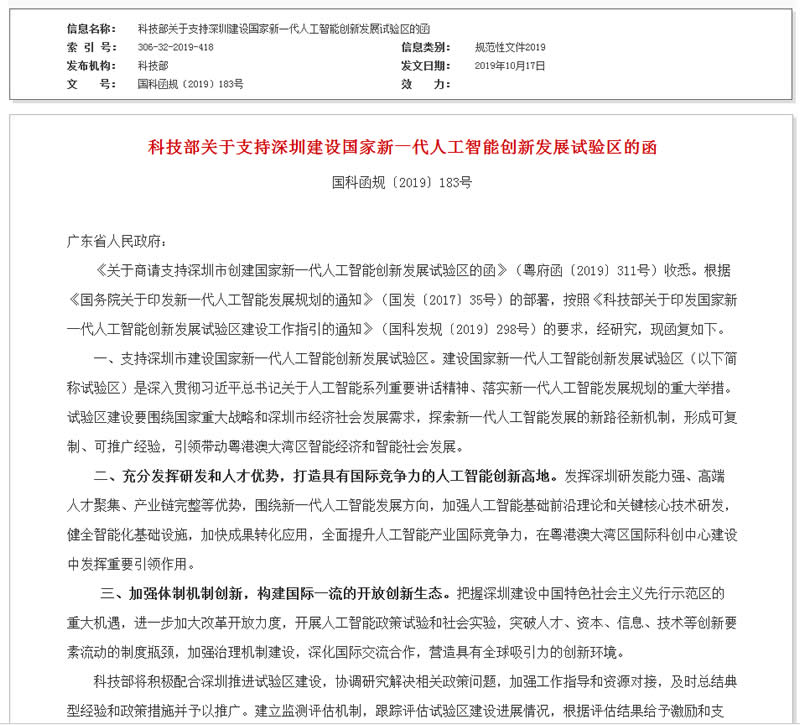 《關(guān)于商請支持深圳市創(chuàng)建新一代人工智能創(chuàng)新發(fā)展試驗區(qū)的函》(粵府函〔2019〕311號)收悉。根據(jù)《國務院關(guān)于印發(fā)新一代人工智能發(fā)展規(guī)劃的通知》(國發(fā)〔2017〕35號)的部署,按照《科技部關(guān)于印發(fā)新一代人工智能創(chuàng)新發(fā)展試驗區(qū)建設(shè)工作指引的通知》(國科發(fā)規(guī)〔2019〕298號)的要求,經(jīng)研究,現(xiàn)函復如下。