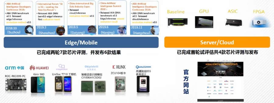 已發(fā)布三輪v0.5版本評(píng)估結(jié)果。其中端側(cè)推斷任務(wù)基準(zhǔn)測(cè)試完成兩輪共7款芯片,云側(cè)推斷任務(wù)完成輪試評(píng)估共4款芯片