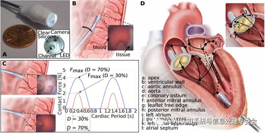 為提升介入手術(shù)的智能化、自主化,哈佛大學(xué)醫(yī)學(xué)院[4]從趨觸性的昆蟲(chóng)中獲得靈感,研發(fā)了一種新型機(jī)器人導(dǎo)管。它可以在充滿血液的心臟中導(dǎo)航,這種導(dǎo)管使用混合觸覺(jué)、視覺(jué)的感知方法,使用圖像進(jìn)行基于觸摸的表面識(shí)別和力傳感,以完成充滿血液的心臟內(nèi)壁跟蹤。觸覺(jué)視覺(jué)傳感器提供了導(dǎo)管尖端的G分辨率視圖,這正是壁跟蹤和設(shè)備部署所需的視圖。該傳感器與機(jī)器學(xué)習(xí)和圖像處理算法相結(jié)合,使機(jī)器人能夠區(qū)分其接觸的物體并控制其接觸力。但在一些特殊、復(fù)雜的位置移動(dòng)時(shí),如:主動(dòng)脈瓣環(huán),成功率還有待提升。在未來(lái),壁跟蹤自主導(dǎo)航可擴(kuò)展到許多微創(chuàng)手術(shù),包括血管、氣道、胃腸道和腦心室系統(tǒng)的手術(shù)。