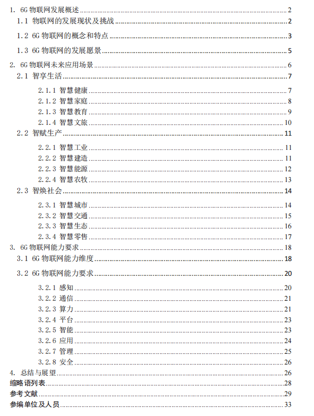 《白皮書》系統(tǒng)化的梳理了6G物聯(lián)網(wǎng)在智享生活、智賦生產(chǎn)和智煥社會(huì)三大L域的未來應(yīng)用場(chǎng)景,并提出在感知、通信、計(jì)算、平臺(tái)、智能、應(yīng)用、管理和安全等方面的能力需求。
