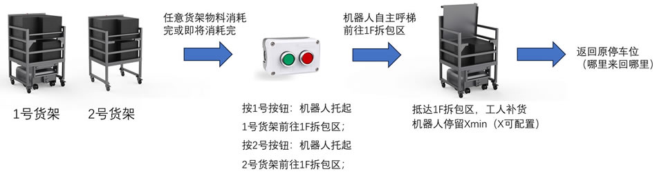 流程簡(jiǎn)述:站點(diǎn)員工通過(guò)物理按鈕,一鍵觸發(fā)機(jī)器人前往1F拆包區(qū)補(bǔ)貨,停留指定時(shí)間后自主乘梯前往SN左基座或SN右基座;