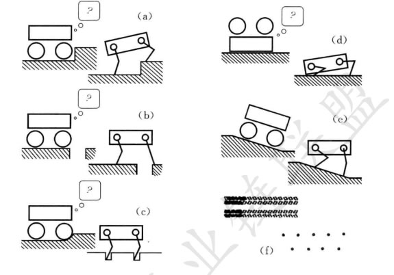 腿式運(yùn)動(dòng)以一系列機(jī)器人和地面之間的點(diǎn)接觸為特征。其主要優(yōu)點(diǎn)包括在粗糙地形上(圖2.5)的自適應(yīng)性和機(jī)動(dòng)性。因?yàn)橹恍枰唤M點(diǎn)接觸,所以只要機(jī)器人能夠 保持適當(dāng)?shù)牡孛嬲麧嵍,這些點(diǎn)之間的地面質(zhì)量是無(wú)關(guān)緊要的。另外,只要行走機(jī)器 人的步距大于洞穴的寬度,它就能跨越洞穴或者裂口。腿式運(yùn)動(dòng)的Z后一個(gè)優(yōu)點(diǎn)是, 能用高度的技巧來(lái)操縱環(huán)境中的物體。舉一個(gè)精彩的昆蟲(chóng)例子,即甲殼蟲(chóng),它用靈巧 的前肢在運(yùn)動(dòng)的同時(shí)能夠滾動(dòng)一個(gè)球。