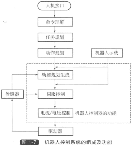 對于一個具有高度智能的機器人,它的控制系統(tǒng)實際上包含了“任務規(guī)劃” “動作規(guī)劃”“軌跡規(guī)劃”和基于模型的 “伺服控制”等多個層次,如圖1-7所示。 機器人先要通過人機接口獲取操作者的 指令,指令的形式可以是人的自然語言, 或者是由人發(fā)出的專用的指令語言,也可 以是通過示教工具輸入的示教指令,或者 鍵盤輸入的機器人指令語言以及計算機程