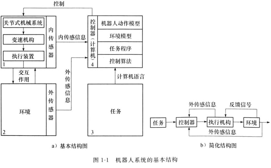 一 般情況下, 一 個(gè)機(jī)器人系統(tǒng)由下列四個(gè)互相作用的部分組成:機(jī)械手、環(huán)境、任務(wù) 和控制器,如圖1 - 1a 所示,圖1 - 16為其簡化形式。