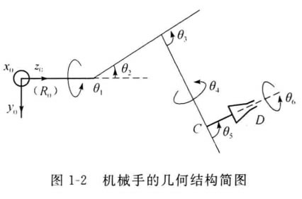 機(jī)械手是具有傳動(dòng)執(zhí)行裝置的機(jī)械,它由臂、關(guān)節(jié)和末端執(zhí)行裝置(工具等)構(gòu)成,組合為一個(gè)互相連接和互相依賴的運(yùn)動(dòng)機(jī)構(gòu)。機(jī) 械手用于執(zhí)行指定的作業(yè)任務(wù)。不同的機(jī)械手 具有不同的結(jié)構(gòu)類型。圖1-2給出機(jī)械手的幾何 結(jié)構(gòu)簡圖。機(jī)械手又稱為操作機(jī)、機(jī)械臂或操 作手。大多數(shù)機(jī)械手是具有幾個(gè)自由度的關(guān)節(jié) 式機(jī)械結(jié)構(gòu), 一般具有六個(gè)自由度。其中,頭 三個(gè)自由度引導(dǎo)夾手裝置至所需位置,而后三 個(gè)自由度用來決定末端執(zhí)行裝置的方向。