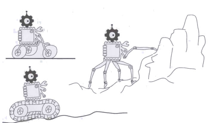 機(jī)器人的驅(qū)動(dòng)方式并不是指機(jī)器人的動(dòng)力究竟是由電機(jī)提供的還是由內(nèi)燃機(jī)提供的,而 是指如何讓機(jī)器人行動(dòng)起來的。比如,有的機(jī)器人只有兩個(gè)輪子驅(qū)動(dòng),有的機(jī)器人則有 3個(gè)輪子驅(qū)動(dòng),有的機(jī)器人使用多足步行的方式行進(jìn),甚至還有的機(jī)器人能像蛇一樣爬 行,像壁虎一樣攀上墻壁。同學(xué)們想過沒有,為什么我們在設(shè)計(jì)機(jī)器人時(shí)要有這么多不同 種類的驅(qū)動(dòng)方式呢?實(shí)際上,這些不同的驅(qū)動(dòng)方式各有各的長處,圖3-1是幾種常見機(jī)器 人驅(qū)動(dòng)方式的示例。