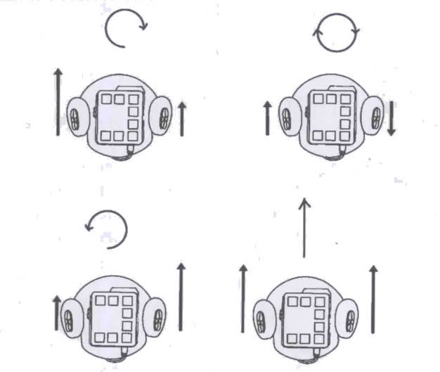 機(jī)器人采用的是Z為常見的一種機(jī)器人驅(qū)動(dòng)方式——雙輪差速驅(qū)動(dòng)。大家 在安裝機(jī)器人的時(shí)候應(yīng)該早就發(fā)現(xiàn)了,我們的小機(jī)器人有兩個(gè)電機(jī)和兩個(gè)輪子(這里不考 慮主要起支撐作用的小腳輪)。對于采用這種驅(qū)動(dòng)方式的機(jī)器人來說,當(dāng)它運(yùn)動(dòng)時(shí),無非 有這么幾種情況:左輪和右輪以同樣的速率向前轉(zhuǎn)動(dòng),機(jī)器人向正前方前進(jìn);左輪和右輪 以同樣的速率向后轉(zhuǎn)動(dòng),機(jī)器人向正后方后退;左輪和右輪的轉(zhuǎn)動(dòng)速度不同時(shí),機(jī)器人就 轉(zhuǎn)彎了,而轉(zhuǎn)彎半徑的大小取決于左右兩個(gè)輪子的轉(zhuǎn)動(dòng)速度之差。還有一種特殊的情況, 如果左輪和右輪的轉(zhuǎn)動(dòng)速率相同,但是方向正好相反時(shí),機(jī)器人就可以實(shí)現(xiàn)原地轉(zhuǎn)動(dòng)。圖 3-2說明了這幾種不同的運(yùn)動(dòng)情況。