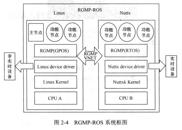 RGMP-ROS的系統(tǒng)框圖如圖2-4所示,整個機器人混合操作系統(tǒng)由兩個部分組 成:一個是安裝在Linux 上的標(biāo)準(zhǔn)ROS 系統(tǒng),另一個是運行在實時操作系統(tǒng)Nuttx 上的實時ROS 系統(tǒng)。我們將運行在Linux 上的ROS 功能節(jié)點稱為非實時ROS 節(jié)點, 運行在實時系統(tǒng)上的ROS 節(jié)點稱為ROS 實時節(jié)點,它們運行在各自的操作系統(tǒng)之 上。實時與非實時節(jié)點之間通過RGMP 提供的VNET 管道進行通信。實時ROS 節(jié) 點運行在Nuttx 之上,能夠通過標(biāo)準(zhǔn)的ROS 通信協(xié)議實現(xiàn)實時節(jié)點與實時節(jié)點、實 時節(jié)點與非實時節(jié)點之間的通信,并且傳遞符合ROS 協(xié)議規(guī)范的消息。實時節(jié)點 通過Nuttx 驅(qū)動與Nuttx 系統(tǒng)內(nèi)核和實時系統(tǒng)掛載的外部設(shè)備進行交互,以達到控 制實時設(shè)備的目的。為了保證實時性,GPOS 與 RTOS 各自擁有d立的外設(shè)。