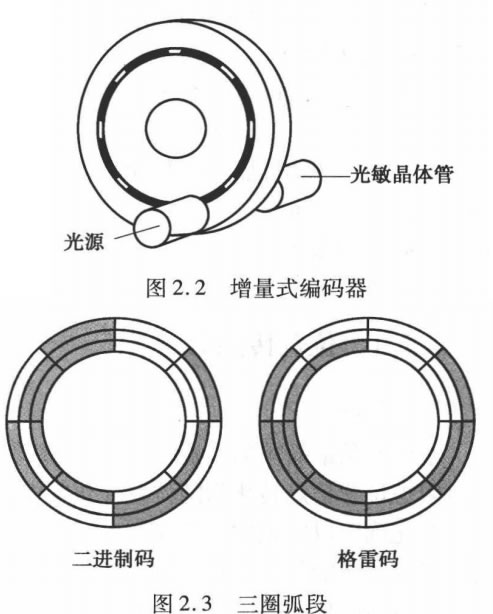 如圖2.3所示,每個位置對應(yīng)著透光與不透光弧段,弧段由多圈弧段(多通道)組成,每個 多圈弧段對應(yīng)不同的碼,這些碼有二進制碼和格雷碼。在二進制碼中,經(jīng)常會發(fā)生多于兩位同 時改變狀態(tài)的情形;而在格雷碼中,每次只有一位向前或向后變化。這種差別的重要性在于, 在數(shù)字測量中,測量系統(tǒng)并非始終讀取信號值,而是要到下一個采樣點才讀取信號值,其間信 號保持不變。在二進制碼中,同一時刻有可能有多于一個信號發(fā)生變化,如果所有信號不是同 時變化,則采樣時可能讀取不到所有位的變化。在格雷碼中,由于同一時刻只有一個信號發(fā)生變化,因此總能檢測到信號的變化。