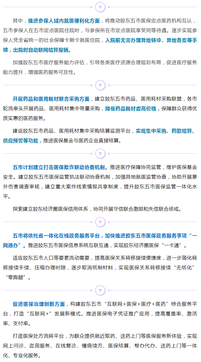 《行動方案》是在山東省醫(yī)保局指導(dǎo)下,由青島、煙臺、威海、濰坊、日照五市醫(yī)保局會商共同制定!缎袆臃桨浮访鞔_,通過構(gòu)建“就醫(yī)服務(wù)便捷、藥械采購協(xié)同、醫(yī)藥產(chǎn)業(yè)集聚、打擊騙保聯(lián)動、信息互通共享”的膠東五市醫(yī)保發(fā)展共同體,促進五市醫(yī)保政策更加均衡,醫(yī)保服務(wù)更加便捷,醫(yī)藥價格更加優(yōu)惠,全力支持和服務(wù)膠東經(jīng)濟圈一體化發(fā)展大局。