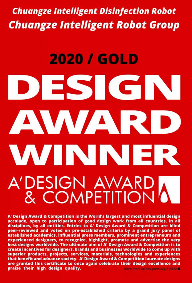 意大利A" Design Award是目前世界上大型的綜合性設(shè)計比賽,被譽為歐洲設(shè)計界的奧斯卡,是L先的國際年度設(shè)計賽事。也是ICSID(國際工業(yè)設(shè)計協(xié)會)、ICOGRADA(國際平面設(shè)計協(xié)會)、ADI (意大利工業(yè)設(shè)計協(xié)會)所認(rèn)可的國際設(shè)計賽事。 2020年至2021年,意大利A" Design Award設(shè)計大賽共收到來自2萬余件設(shè)計作品,所有參賽作品都是通過來自世界各地的學(xué)者、新聞界人士、設(shè)計師同行和行業(yè)專家所組成的頗具規(guī)模、影響力的設(shè)計獎評審團進行評審。此次,創(chuàng)澤集團智能消毒殺菌機器人在眾多設(shè)計作品中脫穎而出榮獲意大利A"Design Award金獎,代表著設(shè)計界至G榮譽,讓創(chuàng)澤集團的設(shè)計作品閃耀于國際舞臺,同時也證明了創(chuàng)澤品牌在市場上的核心競爭力。